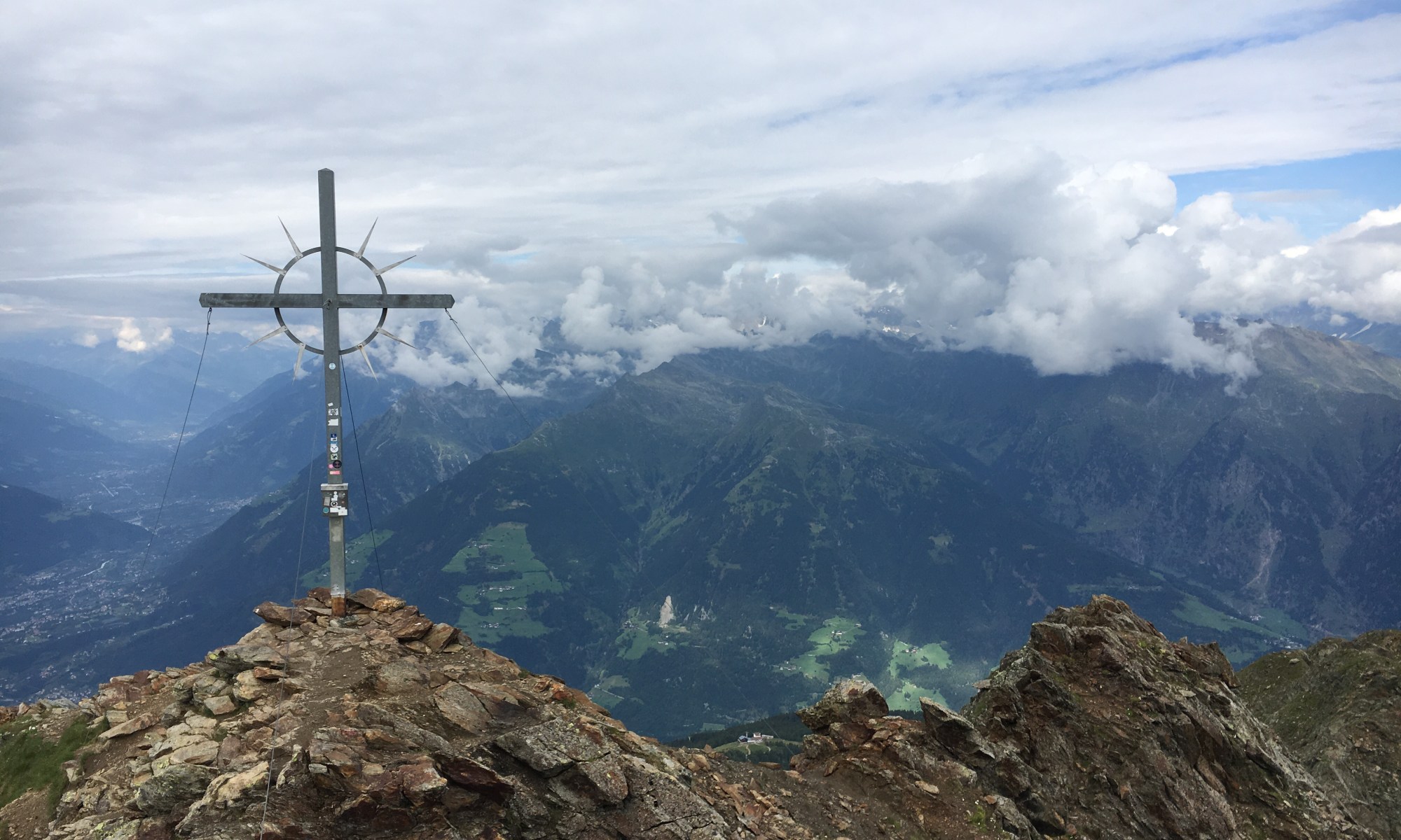 Also starten wir gut gestärkt von der Hirzer Hütte (1.983m) zum Gipfelkreuz des Namensgebers dieser Hütte, dem Hirzer. Um ihn zu erklimmen, müssen wir zuerst 700 HM überwinden, um zur Oberen Scharte (2.698m) zu gelangen. Von hier aus haben wir schon einen wundervollen Blick auf die Brenta-Gruppe, die Ortler-Gruppe, die Ötztaler Alpen und die Dolomiten. Aber wir wollen noch mehr, denn wir wollen ein letztes Mal hoch hinaus 🙂