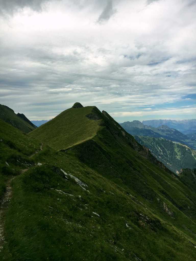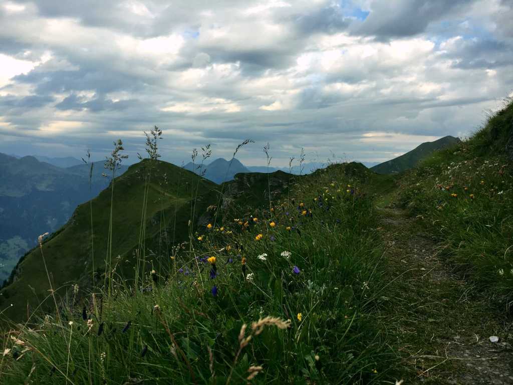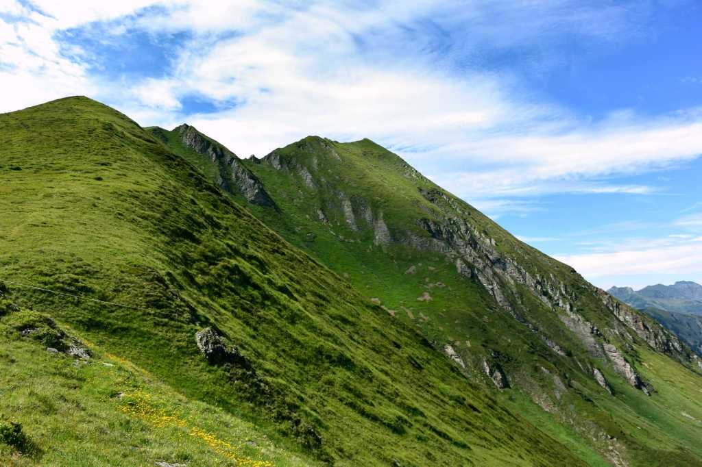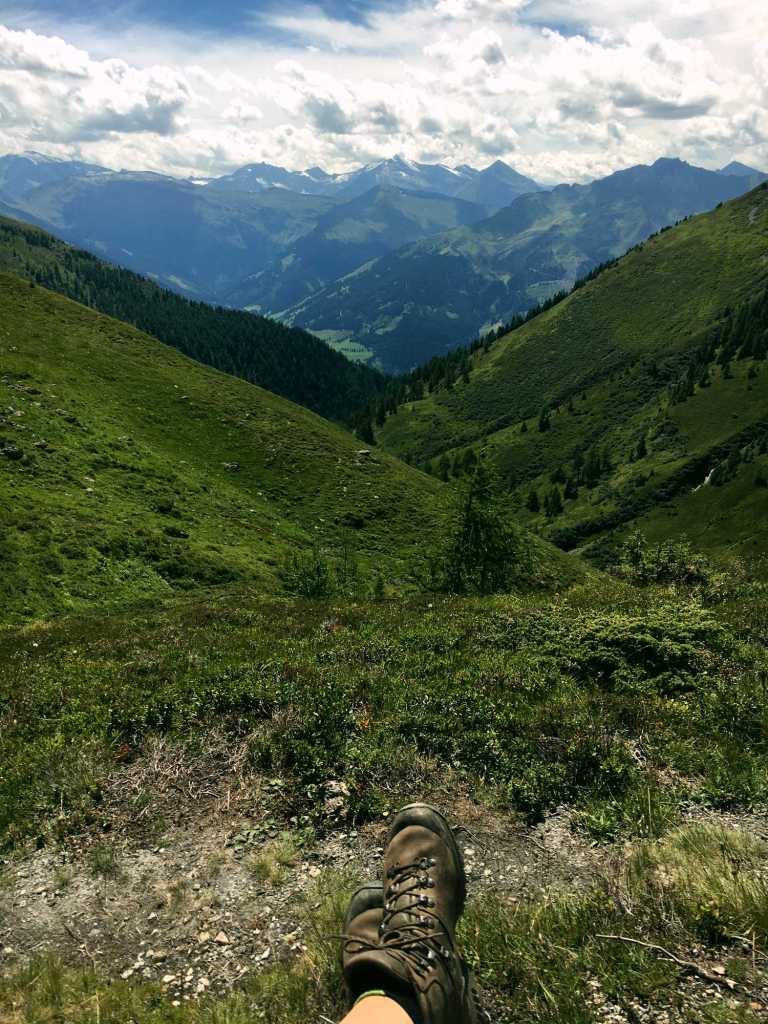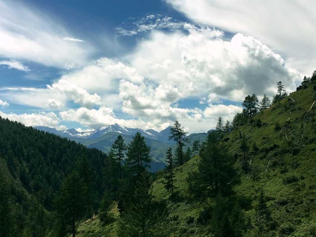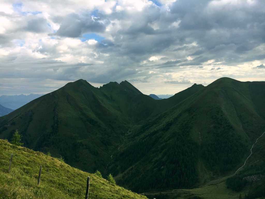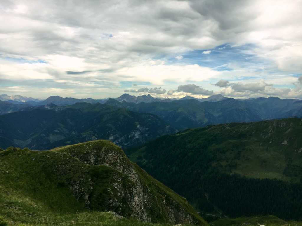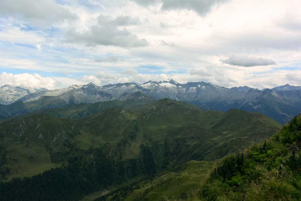 Ab hier geht es über üppige und schöne Südhänge stetig bergauf. Schon auf dem Weg nach oben Richtung Schmalzscharte ist der Ausblick Richtung Hohe Tauern beeindruckend. Ganz weit in der Ferne kann man sogar den Großglocker und mit viel Fantasie den Großvenediger erkennen. Hier und da haben wir Innegehalten, gerastet und die Welt um uns vergessen und wurden dabei von aufmerksamen Gämsen beobachtet.