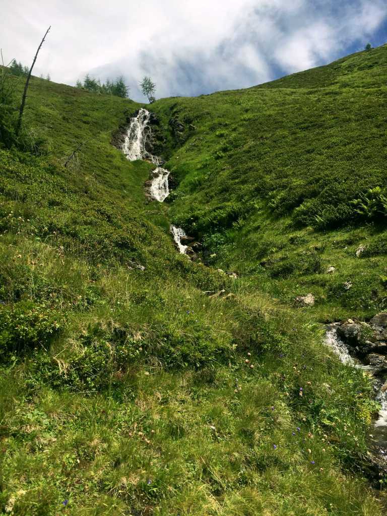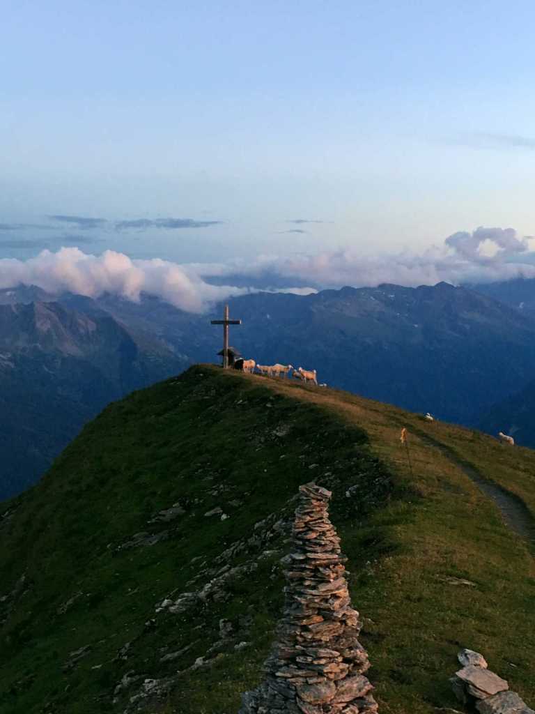 Beim Abstieg haben wir bei der Rauchkogel Scharte, 2.205 m, noch einen Abstecher auf den Rauchkogel auf 2.208 m gemacht. Um 8 Uhr am Gipfelkreuz rasten und ruhen und dabei keiner Menschenseele begegnen, ist einfach nur wunderschön. Nach knapp 2 h sind wir wieder bei der Rastötzenalm angekommen und gehen über den Fortsweg (auf dem wir schon gestern aufgestiegen sind) wieder Richtung Parkplatz.