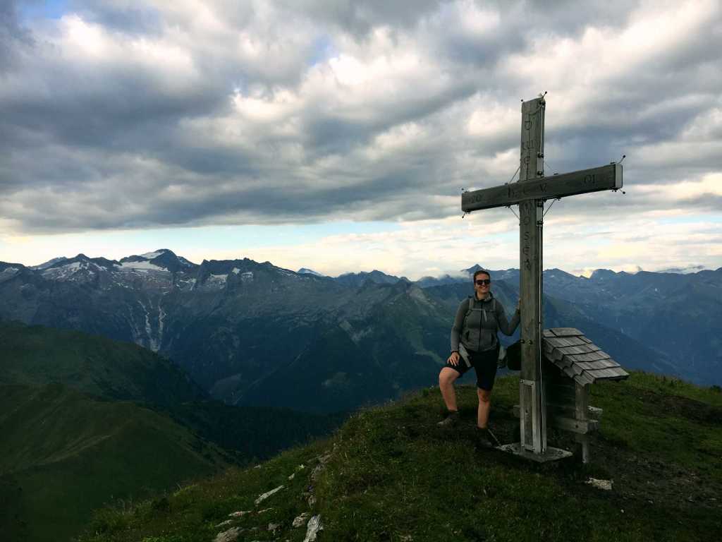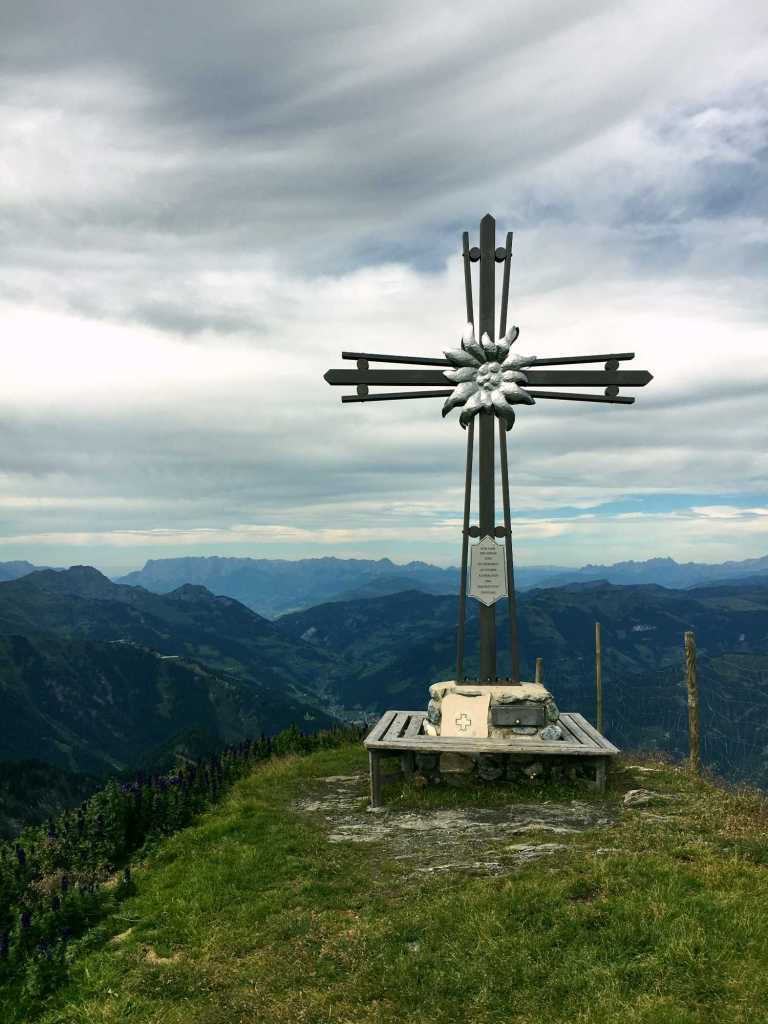 Oben auf der Schmalzscharte auf 2.159 m angekommen, eröffnet sich uns nun auch der Blick Richtung Dachstein-Region und das Kaisergebirge. Zur Gamskarkogelhütte und dem Gipfel sind es nun noch gute 1 1/2 Stunden. Auf dem wunderbaren Höhenweg dahin überschreiten wir aber erst noch den Frauenkogel. Der Frauenkogel auf 2.424 m bietet bereits schon einen 360° Alpen-Rundumblick und ein wunderschönes Gipfelkreuz, an dem man gern das Gipfelglück genießt.