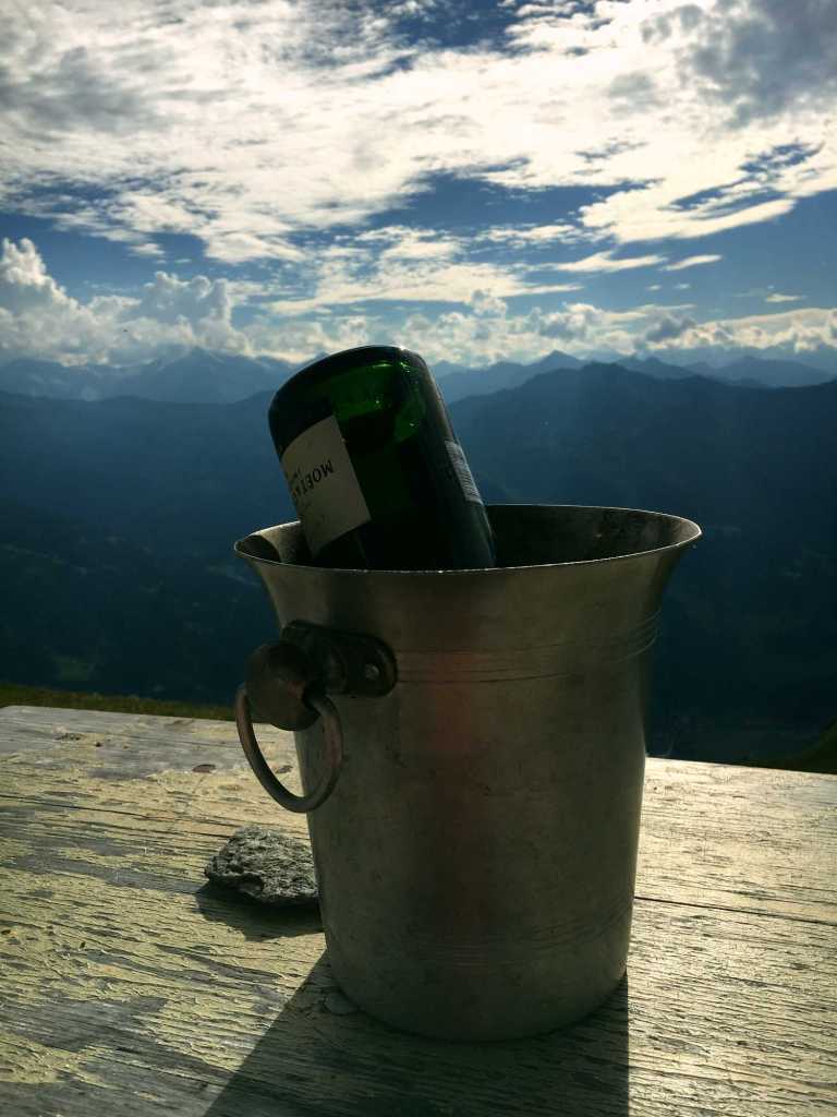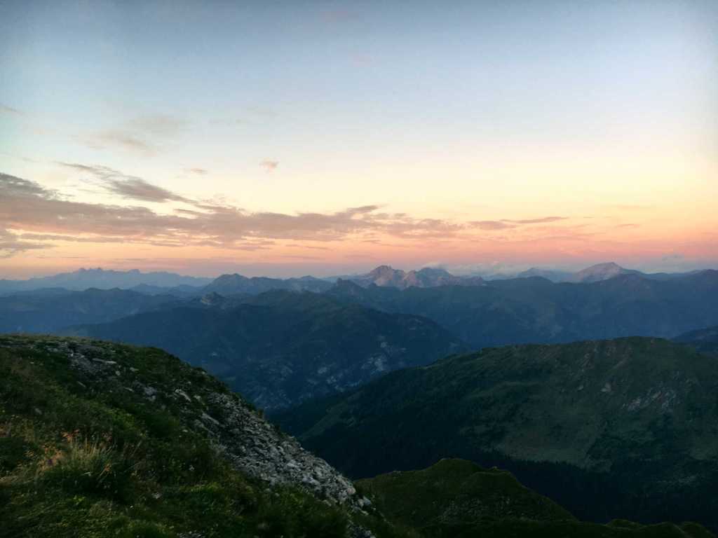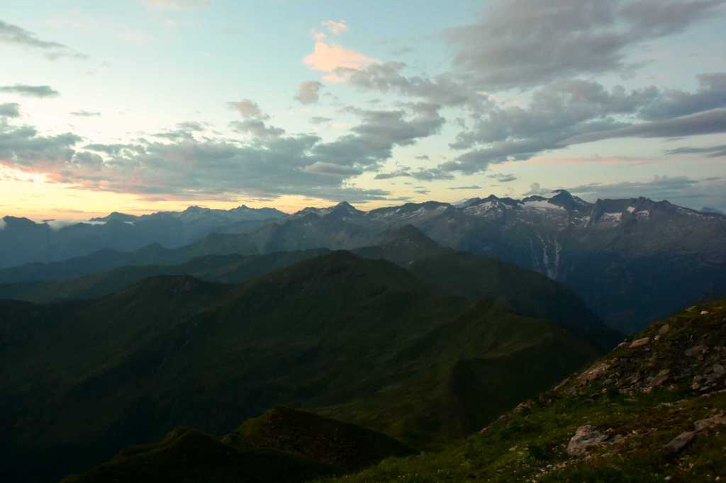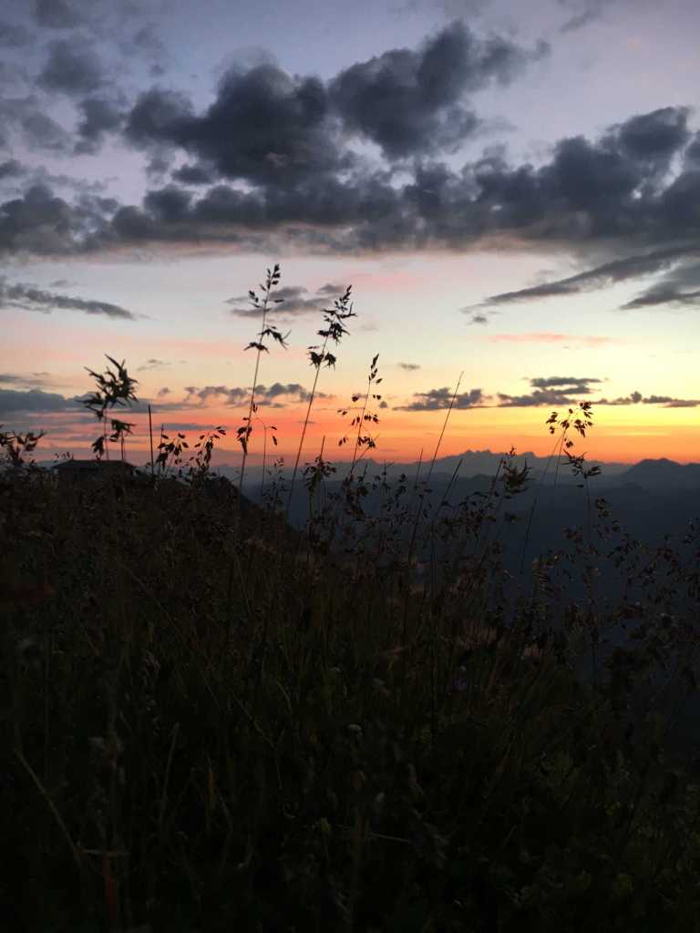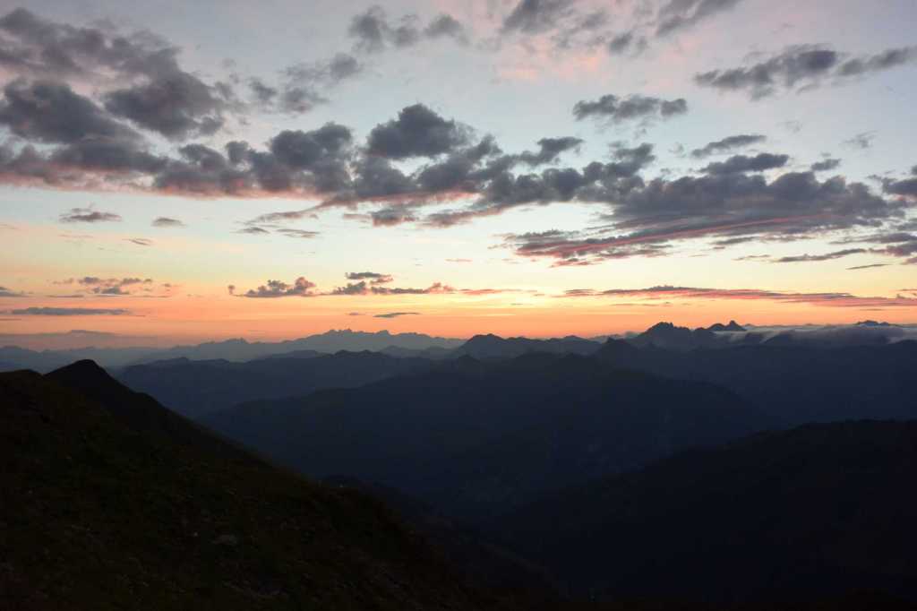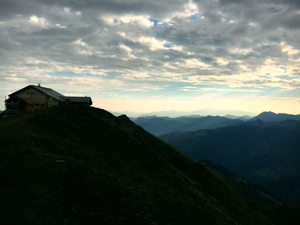Die Hütte wird gerade renoviert, was unserem Aufenthalt aber keinen Abbruch tat. Dafür war der Wirt umso herzlicher. Der Hüttenabend war unvergesslich. Neben leckerem Gösser-Bier, einer deftigen Linsensuppe und ausreichend Gelegenheit zum Schnapseln hatten wir gute Unterhaltung und nette Gesellschaft. Dabei konnten wir von der Terrasse auszuschauen, wie Sonne langsam unterging und uns ein malerisches Bild nach dem anderen lieferte.