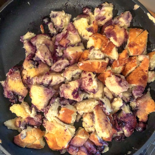Den Teig bereiten wir wie oben in Schritt 1 und 2 beschrieben bis Schritt 3 vor. Wir erhitzen die Pfanne und geben die Butter hinein. Dazu kommt jetzt der Zucker und die Blaubeeren, diese dünsten wir kurz an und lassen den Zucker ein wenig karamellisieren. Wenn das erledigt ist, kommt der Teig drauf und wird erst von dieser Seite (auf max. mittlerer Hitze), dann von der anderen Seite ausgebacken , zerrupft und serviert.