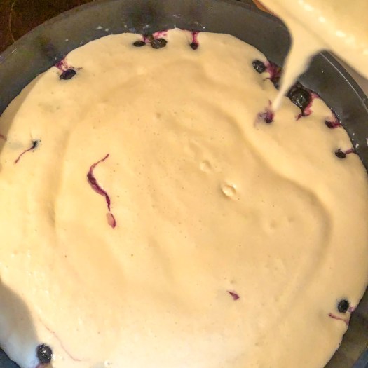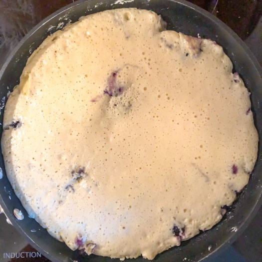 Den Teig bereiten wir wie oben in Schritt 1 und 2 beschrieben bis Schritt 3 vor. Wir erhitzen die Pfanne und geben die Butter hinein. Dazu kommt jetzt der Zucker und die Blaubeeren, diese dünsten wir kurz an und lassen den Zucker ein wenig karamellisieren. Wenn das erledigt ist, kommt der Teig drauf und wird erst von dieser Seite (auf max. mittlerer Hitze), dann von der anderen Seite ausgebacken , zerrupft und serviert.